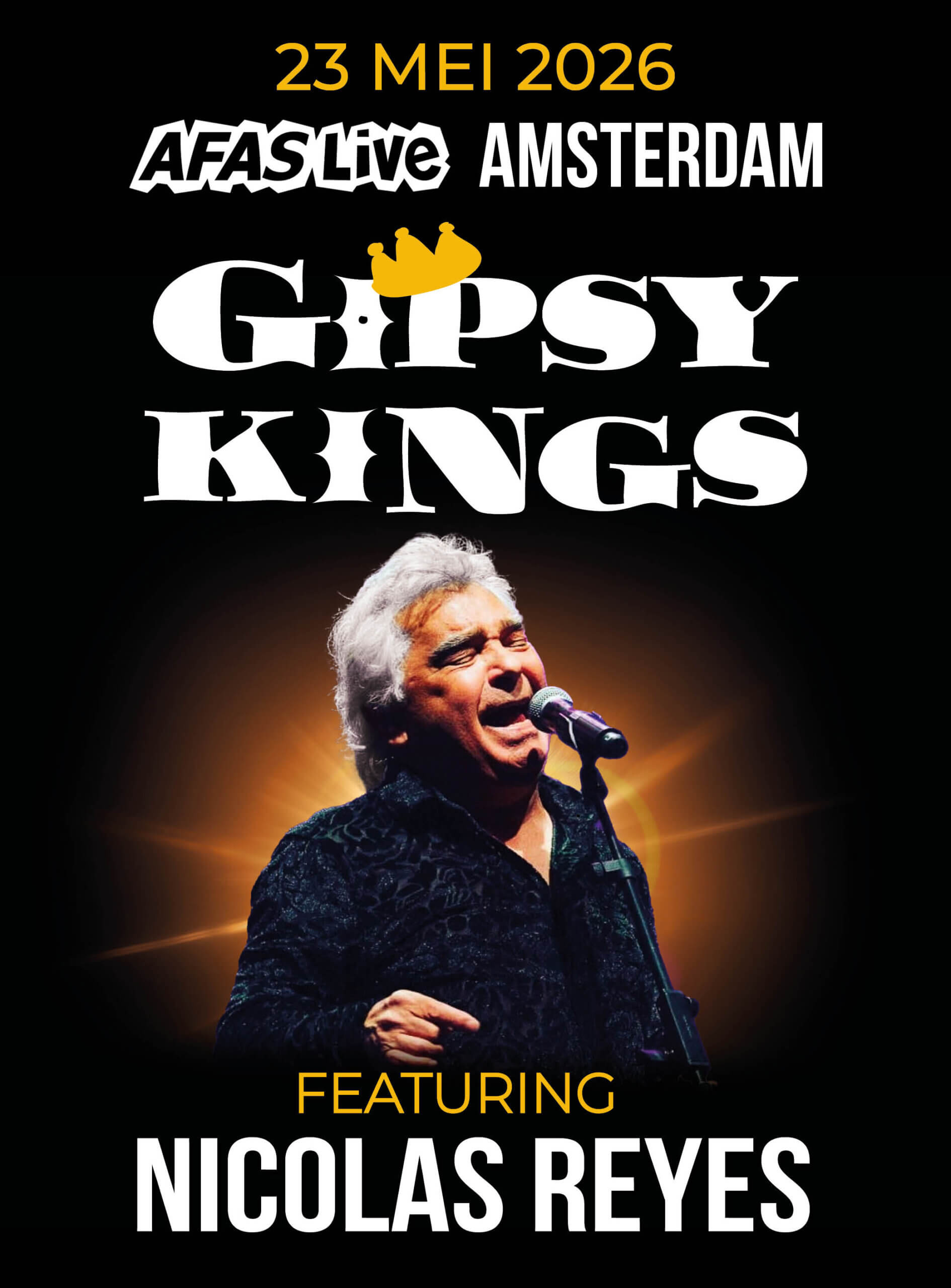 Bekend om het samensmelten van traditionele flamencostijlen met westerse pop en latin, speelt de met een Grammy bekroonde band Gipsy Kings met Nicolas Reyes op zaterdag 23 mei 2026 in AFAS Live Amsterdam.